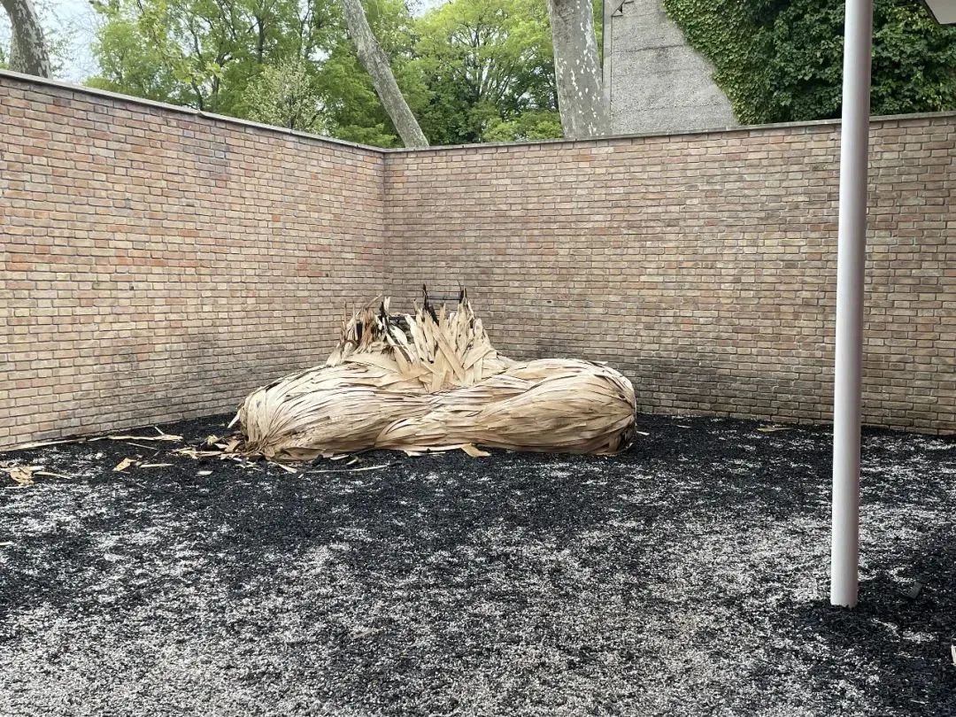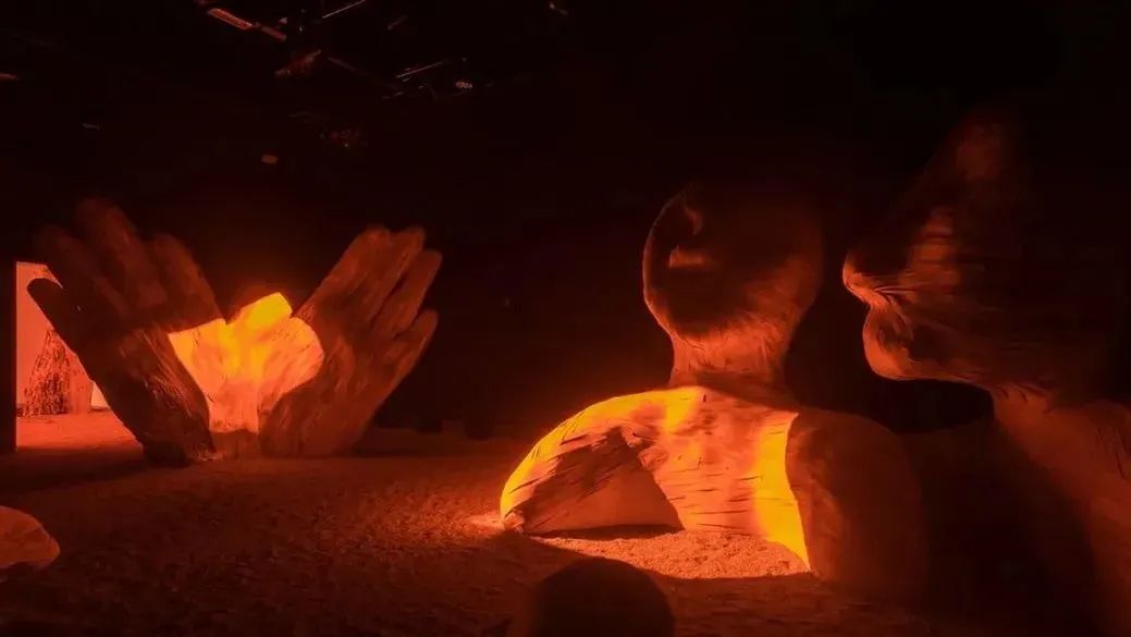 瑞士馆的艺术家们回收了瑞士馆在过去双年展中使用过的废料,用这些废料重新搭建了新的装置作品。这些装置作品被设计成了截断的下肢、倒下的躯体、姿势怪异的巨手……艺术家利用灯光颜色,在展厅入口和展厅内部之间巧妙地设计了“昼夜”交替的视觉冲击。在瑞士的民俗文化中,人们会在六月底之前举办篝火仪式,通过燃烧稻草人来防止恶魔和疾病,赶走冬天。在这种语境下,火焰象征着结束和新的开始,以及时间的循环性。