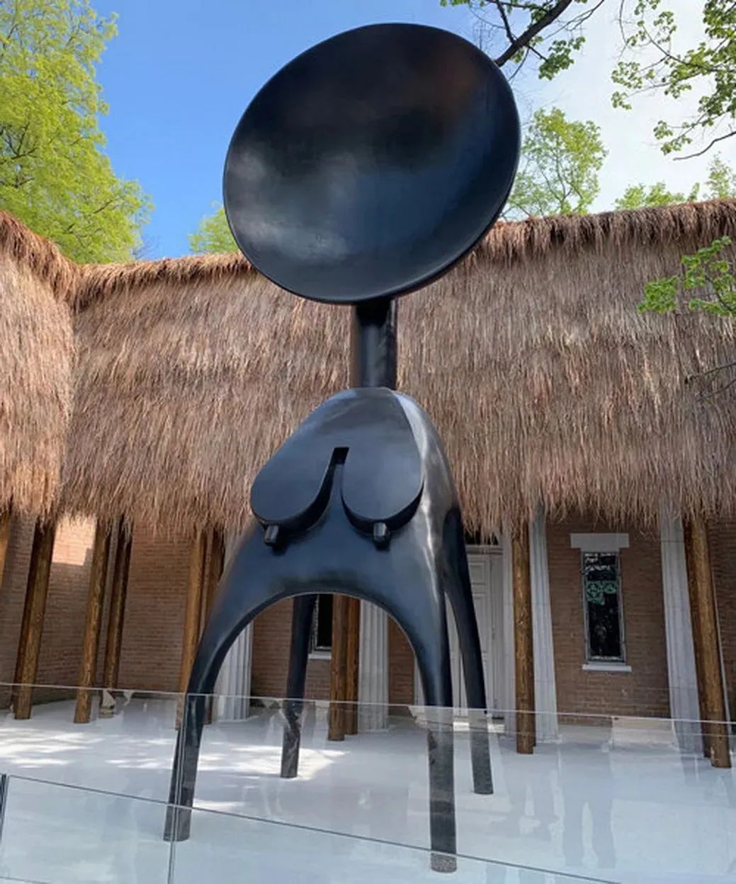 美国馆建筑受杰斐逊样式启发,Simone Leigh(西蒙娜·利)在展览空间中陈列了坚韧而独特的具象雕塑。这个为美国馆创作的大型作品综合了对非洲侨民和早期美国黑人历史的借鉴。
