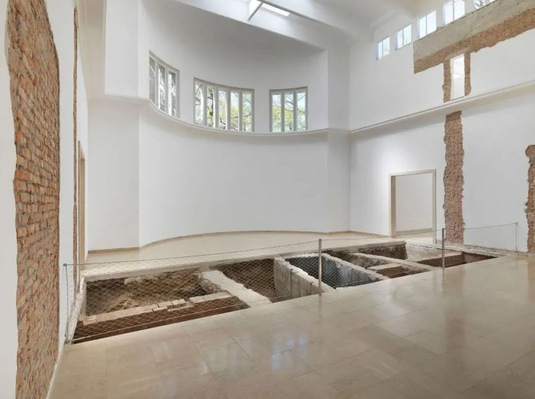 这是一个关于破坏场地的装置。展馆内暴露的结构是艺术家Maria Eichhorn用于揭露纳粹权政期间对展馆的加建和扩建的隐喻,而墙上的文字记录了这段历史中对该行为的记录。