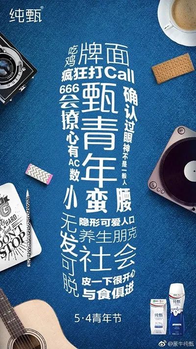 如果从青年的社会行为方面来拍视频的话,其实是很能获得共鸣宣传的。可以从这些方面来创造视频剧情,例如:1. 大家对这一代青年的评价褒贬不一,但青年不接受定义。2. 70后,80后,90后,00后的生活方式对比。可以将商品加入,真青年就该喝纯甄等等。