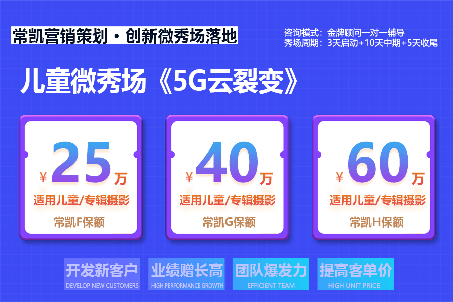 常凯营销策划《微秀场·5G云裂变》线下1V1专业顾问对接营销服务,全案制定、全员培训、营销落地执行、流量裂变、客资成交、流量入店、业绩成交、数据复盘。给你全方位的服务,细致严谨,投资回报比高。......